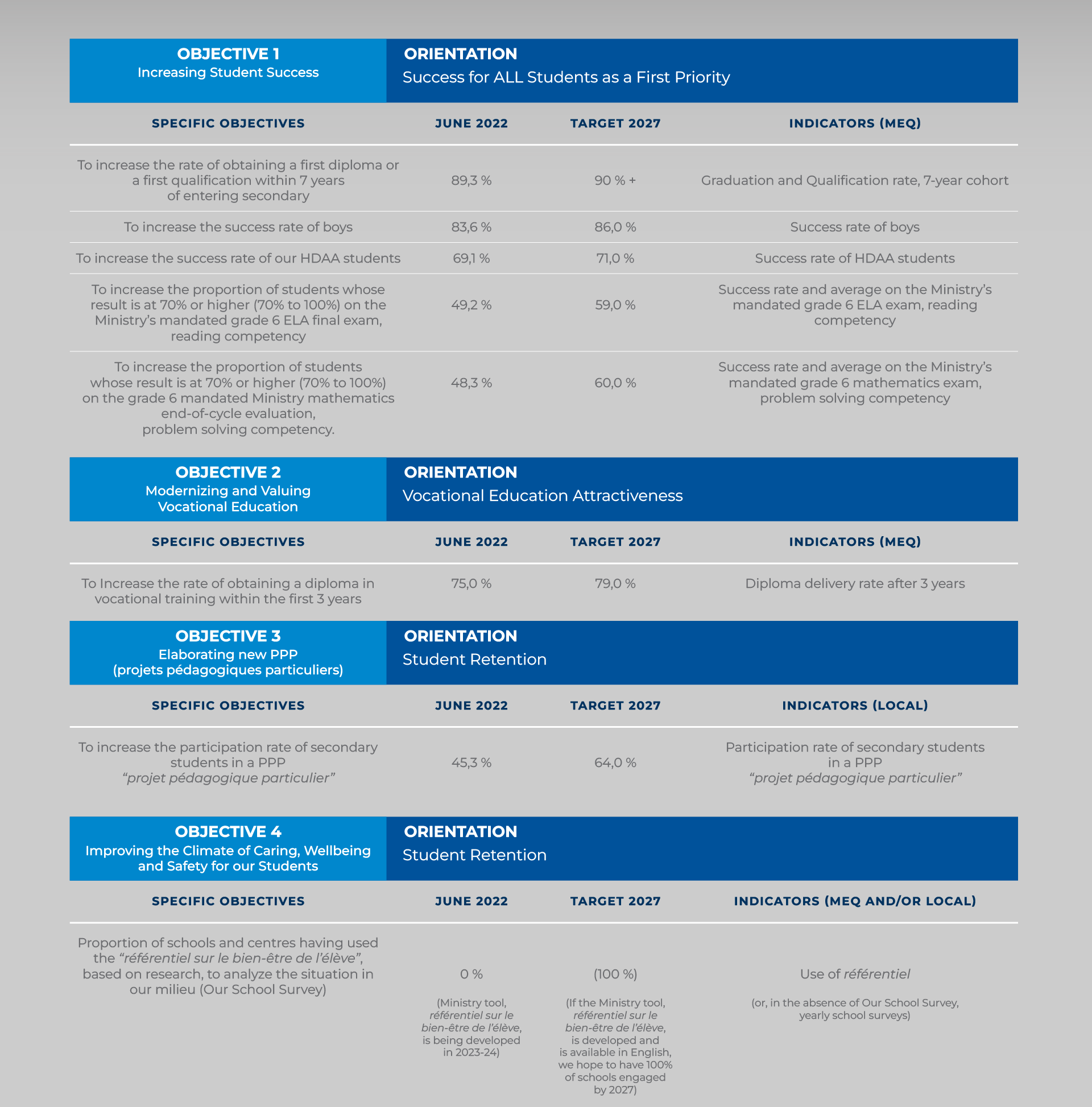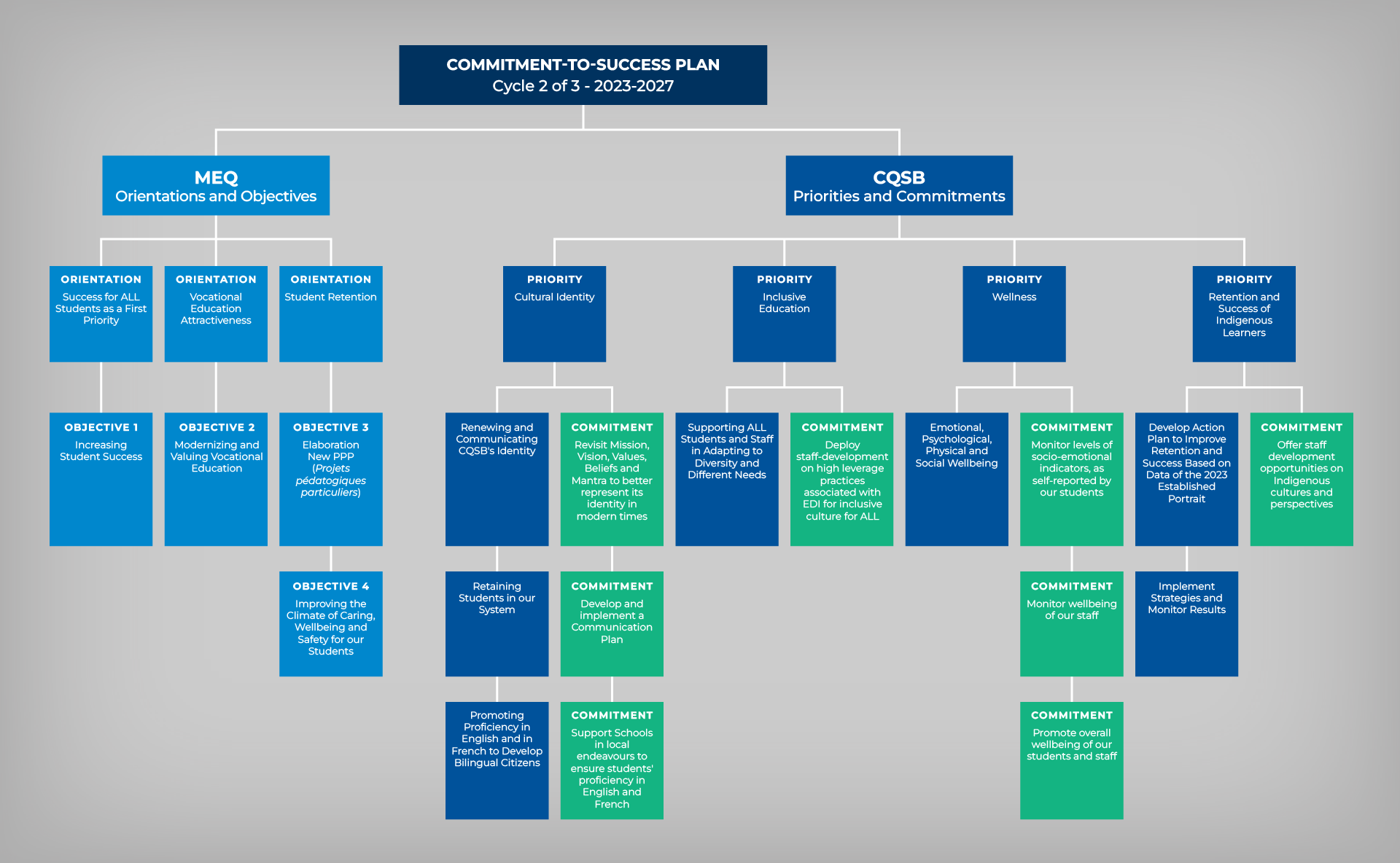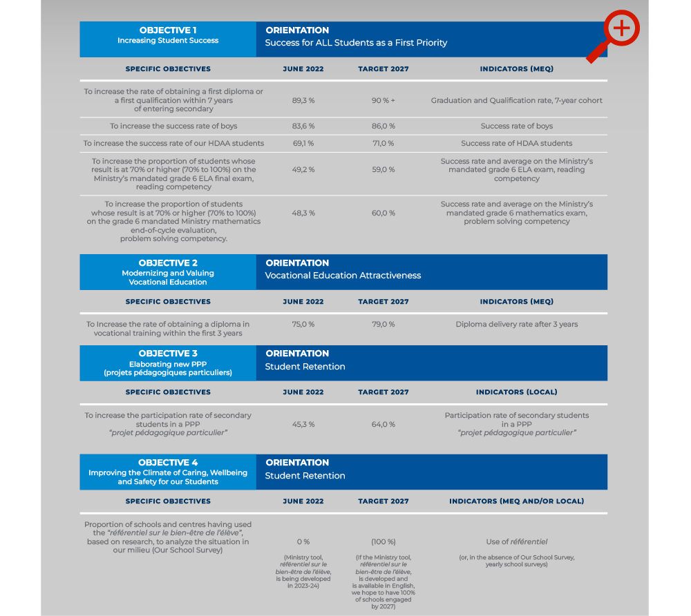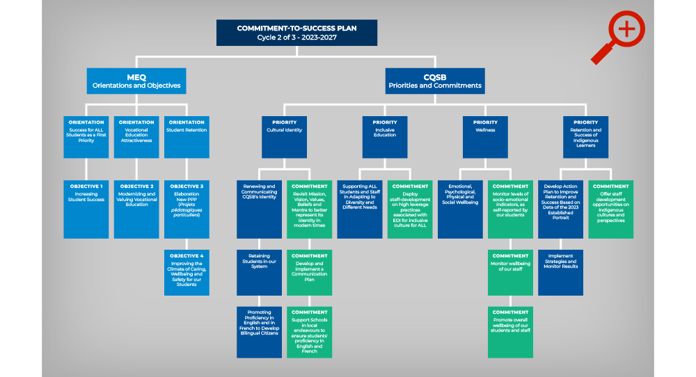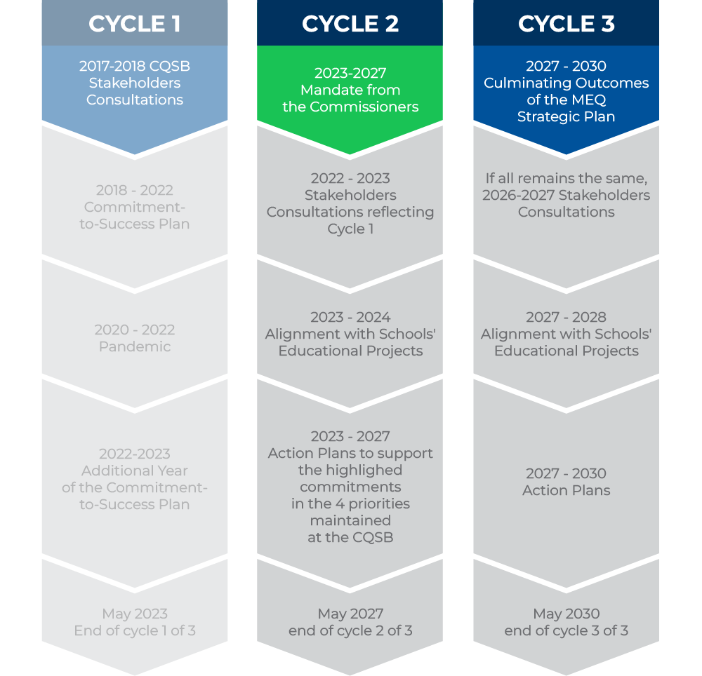 Aligned with the Ministère de l’Éducation (MEQ) Strategic Plan and Policy on Educational Success, our Commitment-to-Success Plan is structured into three successive cycles.