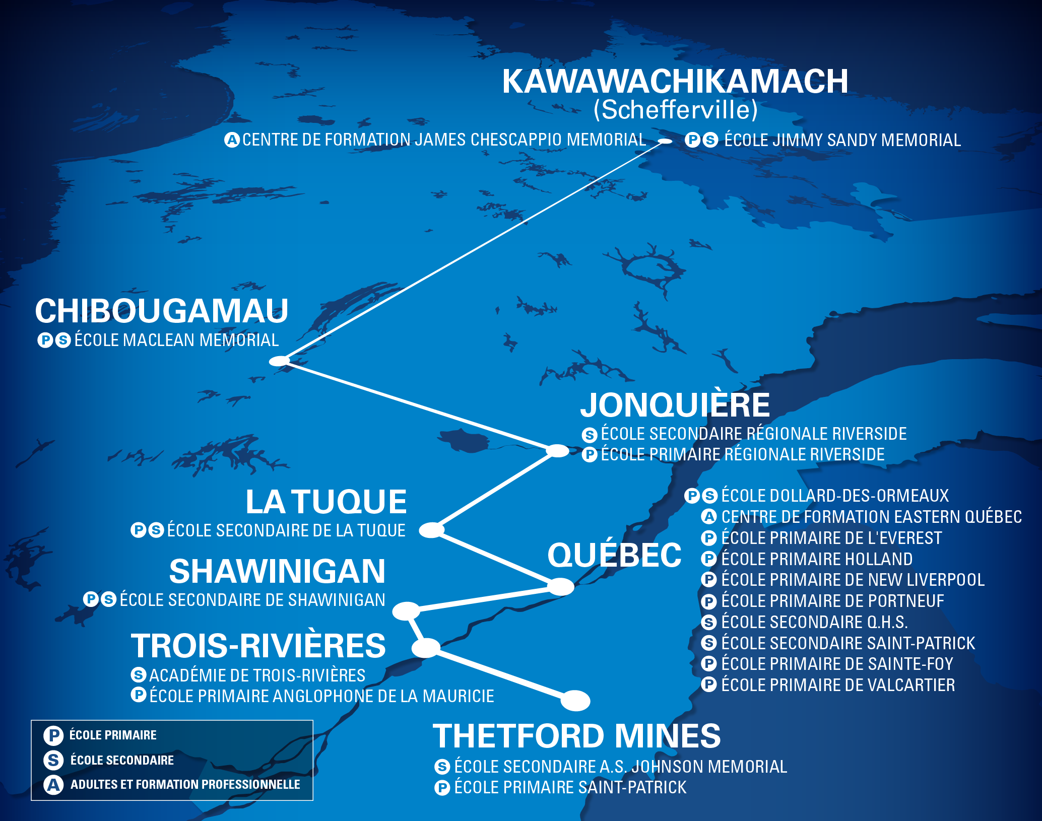La Commission scolaire Central Québec (CSCQ) est une organisation publique anglophone où employé-e-s et élèves apprennent à grandir ensemble. Nous sommes une famille tissée serré répartie dans plusieurs établissements sur un territoire de plus de 515 000 km². Tissée serré? Absolument! Tout est possible lorsqu’on grandit ensemble!