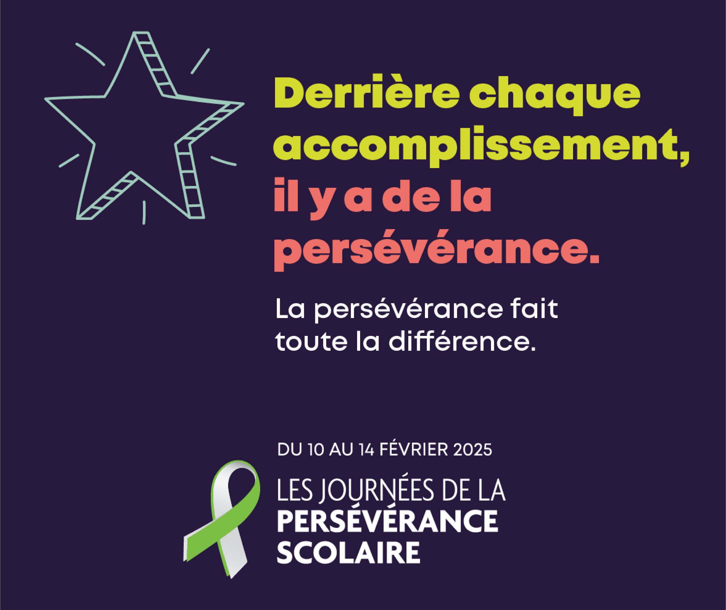 Du 16 au 20 février 2026, joignez-vous au mouvement pour soutenir toutes les personnes qui apprennent, avancent et persévèrent. Il y a plusieurs façons de participer. Choisissez celles qui vous inspirent : journeesperseverancescolaire.com