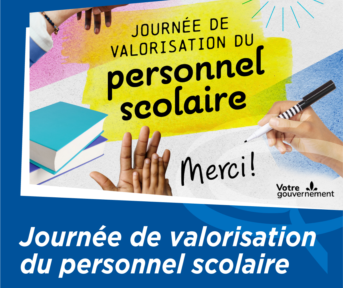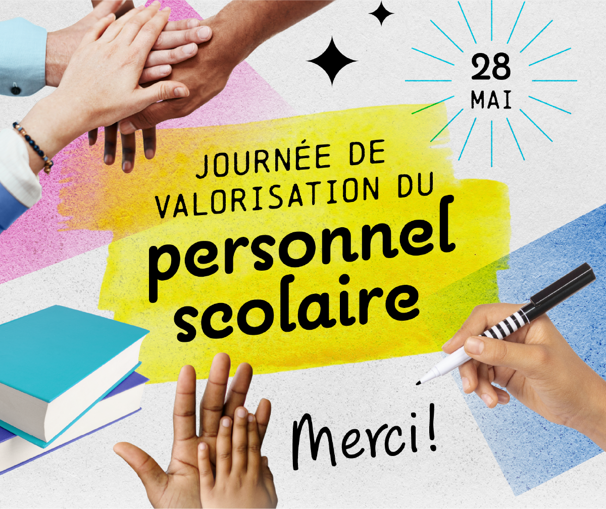 Pour cette 4e édition de la Journée de valorisation du personnel scolaire, nous ne pouvons passer sous silence le travail exceptionnel accompli chaque jour par notre personnel de soutien, notre personnel professionnel, notre personnel enseignant ainsi que nos administrateurs. C’est grâce à l’engagement de chacun d’entre nous que, d’année en année, nous accomplissons avec succès notre mission éducative. Bravo à toutes et à tous !