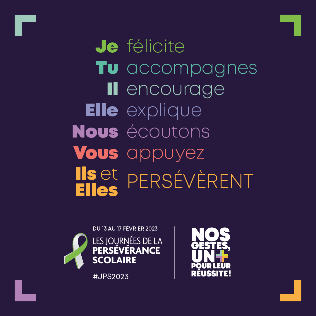 Du 13 au 17 février 2023, ont lieu les Journées de la persévérance scolaire et la Commission scolaire Central Québec tient à remercier chaleureusement et à mettre en lumière tous ceux qui s’impliquent dans la réussite des jeunes. Que vous soyez parents, tuteurs, enseignants, personnel de soutien, professionnel ou cadre, votre soutien et votre présence réconfortante et bienveillante multiplient incontestablement les possibilités de réussite éducative des élèves.