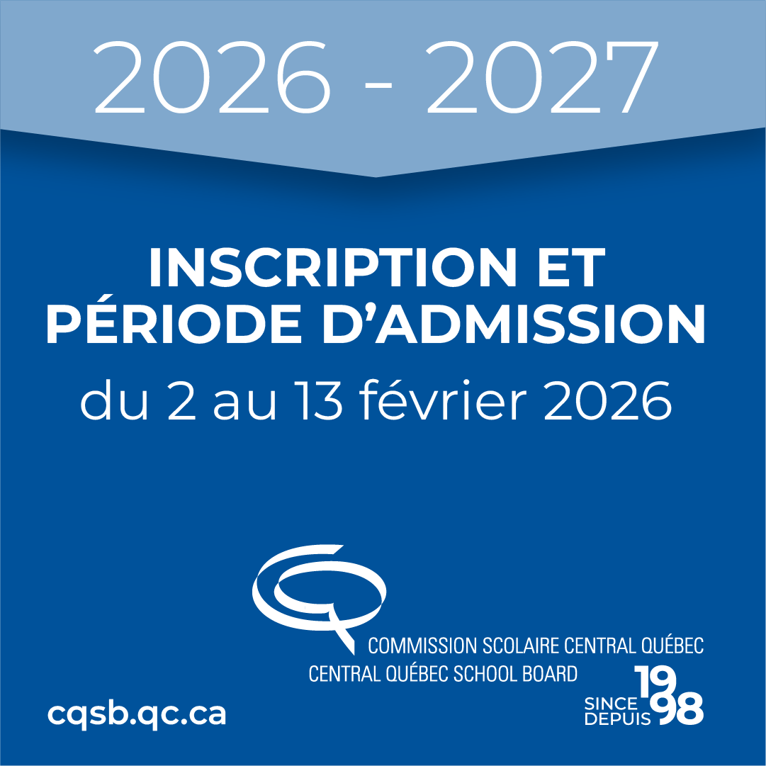 La période officielle d’inscription à l’école pour l’année scolaire 2026-2027 se tiendra du 2 au 13 février 2026. Les parents d’élèves qui fréquentent déjà une école de la commission scolaire Central Québec en 2025-2026 devront procéder à la réinscription de leur enfant en ligne, par le biais de la plateforme Mozaïk. Veuillez noter que la réinscription ne peut pas se faire à partir de l’application Clic école. Avant la fin du mois de janvier, les écoles feront parvenir davantage d’information aux parents par courriel. Les parents qui souhaitent inscrire leur enfant pour la première fois dans une école de la commission scolaire Central Québec devront se procurer les documents nécessaires en version papier auprès de l’école associée à leur territoire. Afin de connaître l’école associée à votre territoire, veuillez utiliser l’outil « Trouver votre école » disponible dans l’onglet du même nom sur le site Web de la commission scolaire. Pour obtenir plus d’information au sujet de l’inscription à l’école, veuillez consulter la section « Inscriptions » qui se trouve dans l’onglet « Renseignements aux parents ».
