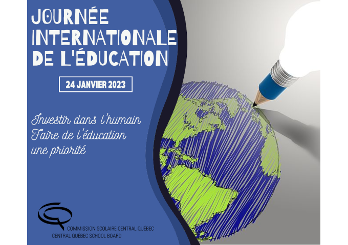 En ce 24 janvier, la Commission scolaire Central Québec (CSCQ) souligne la Journée internationale de l’éducation. Notre raison d'être, comme commission scolaire, est de fournir la meilleure éducation possible à tous nos élèves afin de leur permettre un futur des plus brillant. Le thème de cette année « investir dans l’humain, faire de l’éducation une priorité » fait partie intégrante des valeurs fondamentales qui sont au cœur de notre commission scolaire.